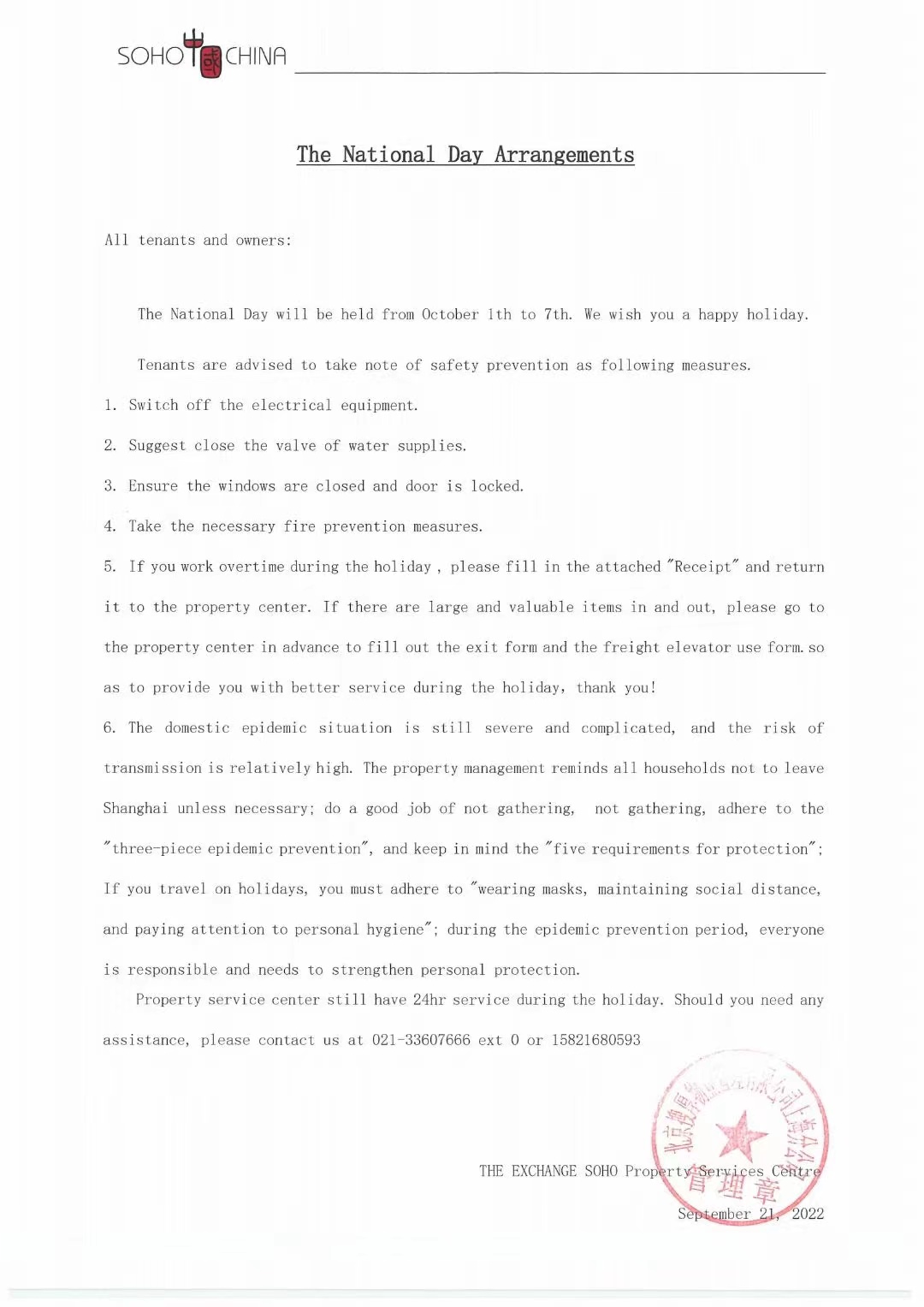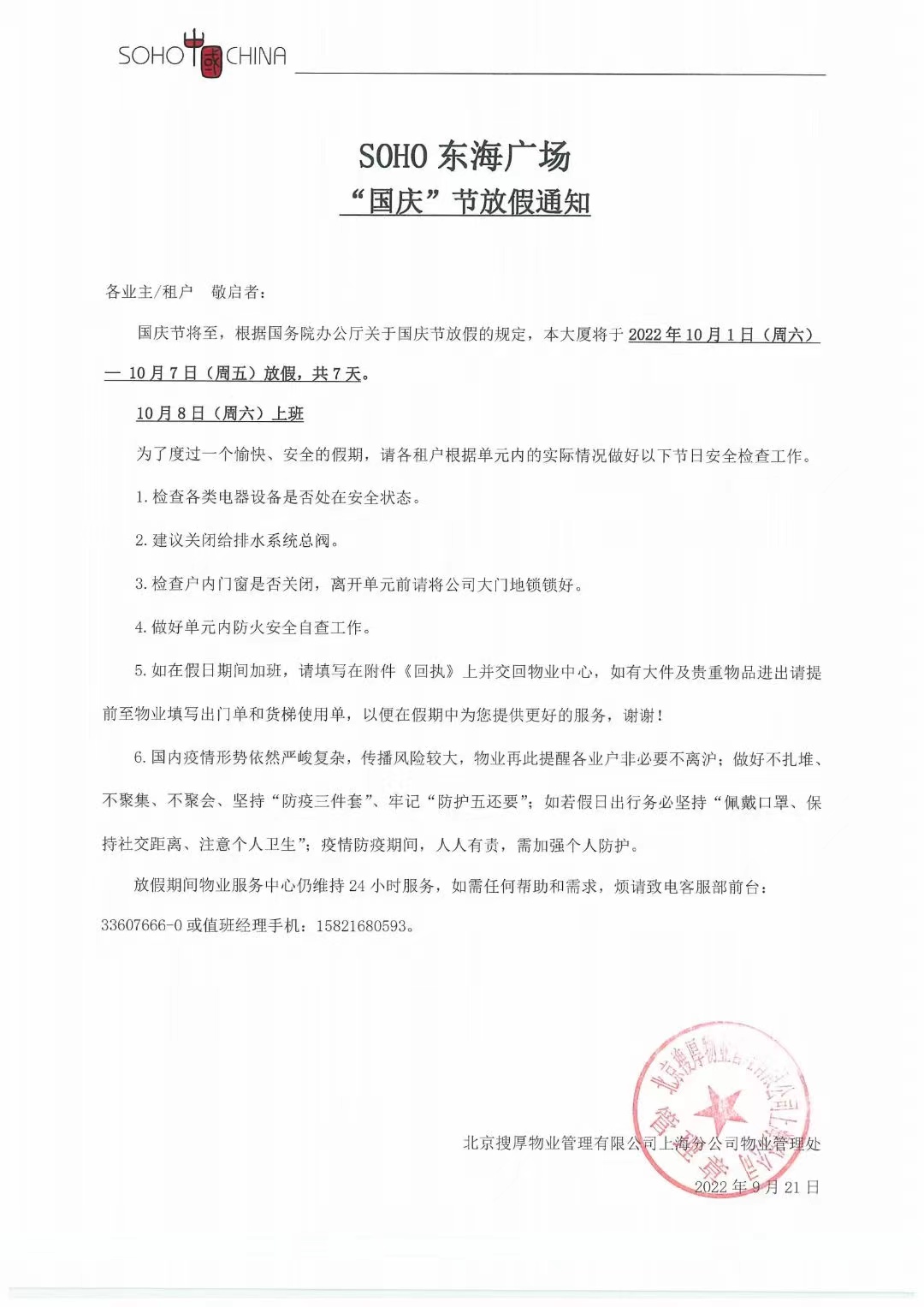 SOHO东海广场2022年“国庆”节放假通知