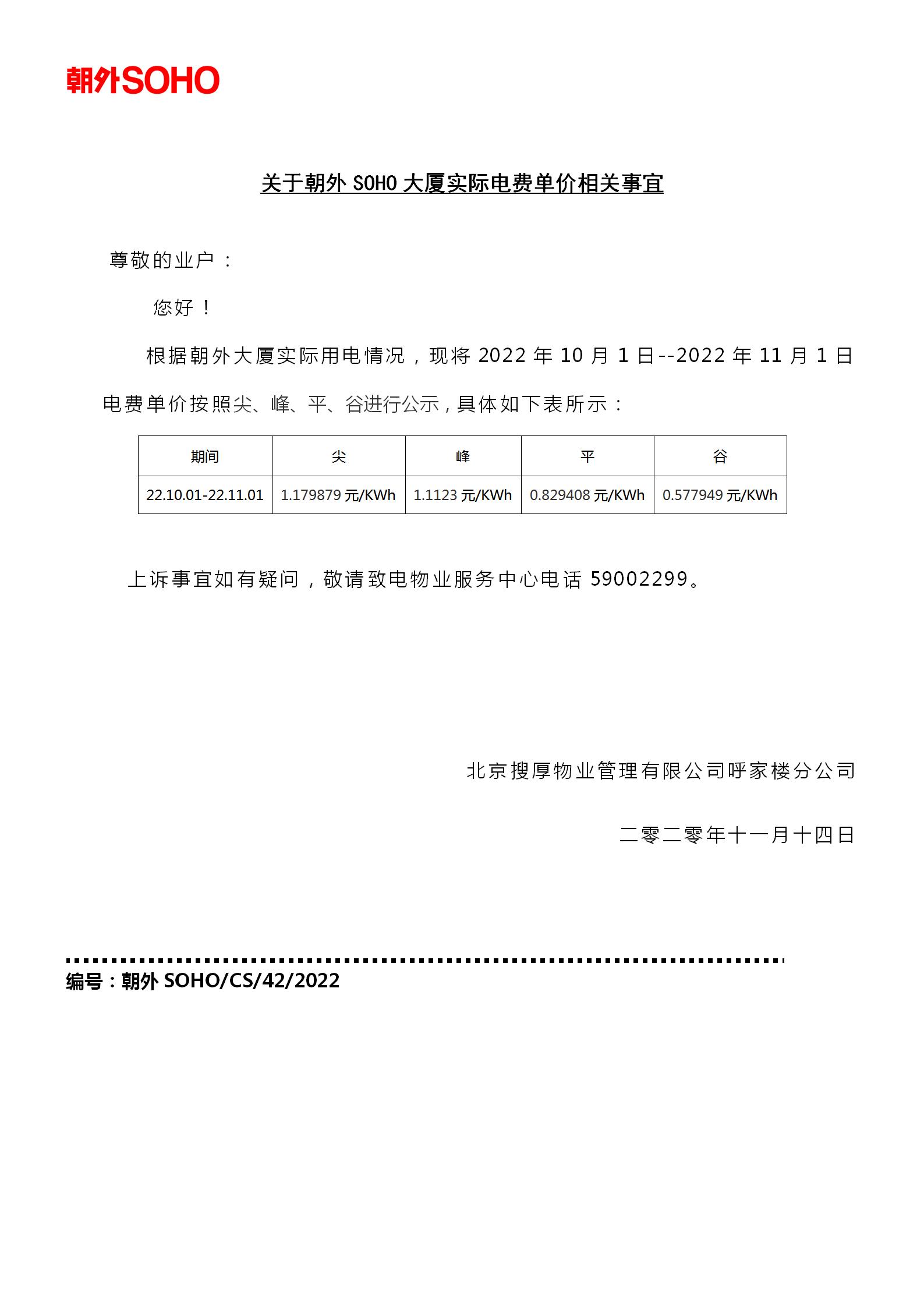 关于朝外SOHO大厦2022.10.01-2022.11.01期间实际电费单价相关事宜