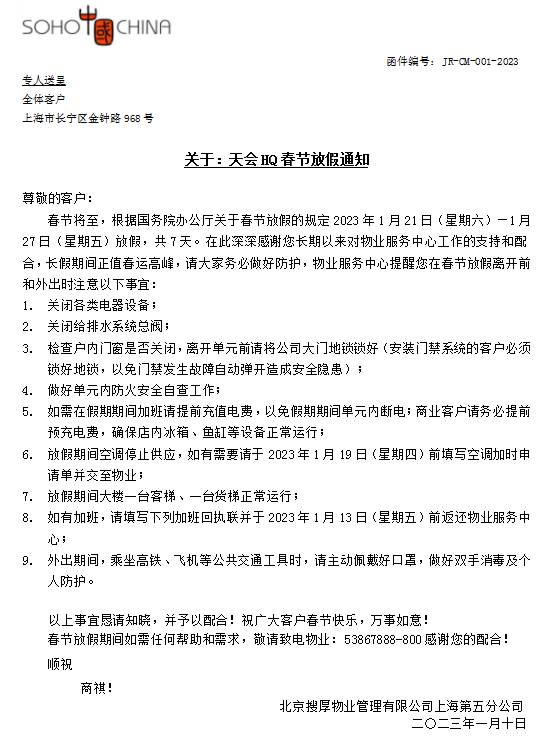 关于:天会HQ春节放假通知