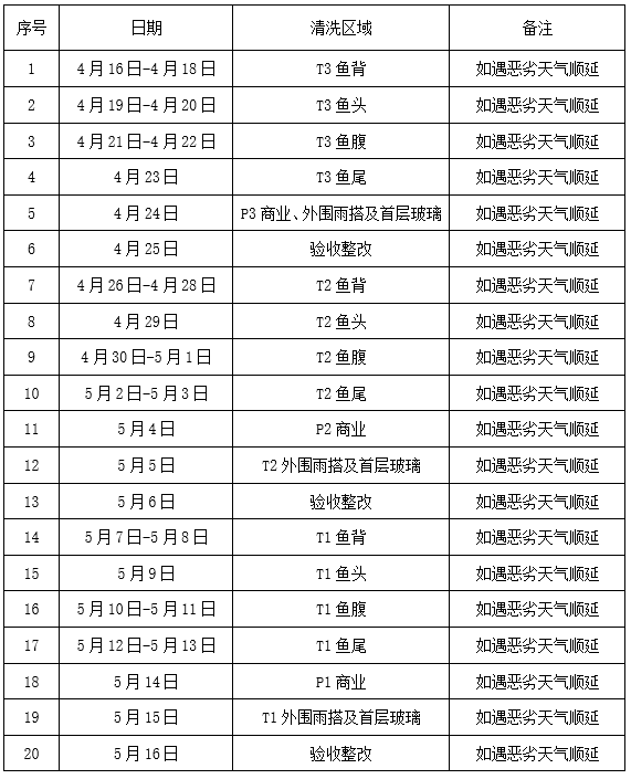 此次清洁工作期间如遇下雨、大风等客观原因导致清洗工作无法进行时,清洗工期将自动顺延。