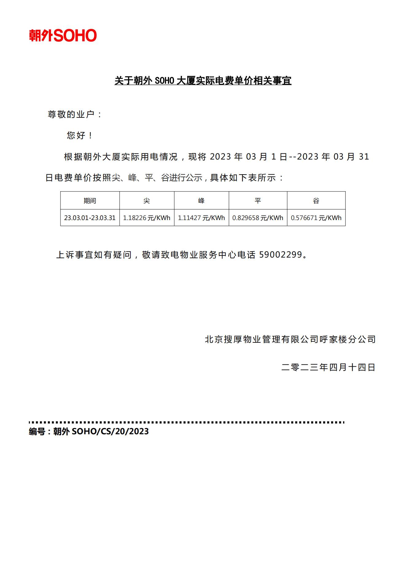 关于朝外SOHO大厦2023.03.01-2023.03.31期间实际电费单价相关事宜