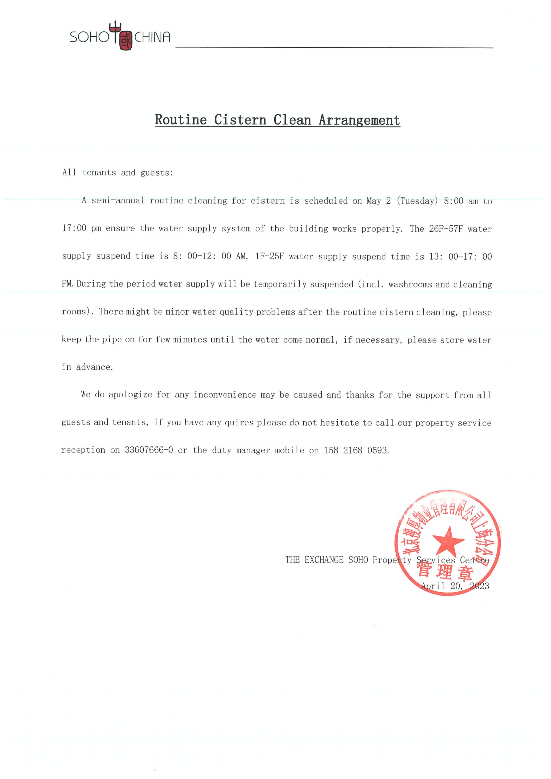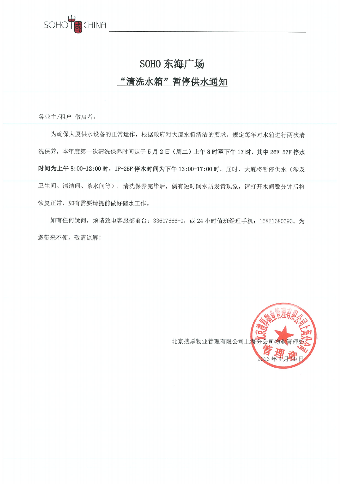 SOHO东海广场2023年水箱清洗的通知