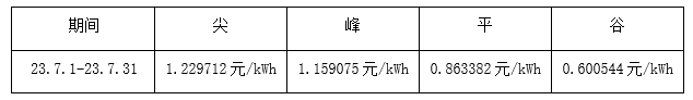 根据望京SOHO大厦实际用电情况,现将2023年7月1日-2023年7月31日电费单价按照尖、峰、平、谷进行公示,具体如下表所示: