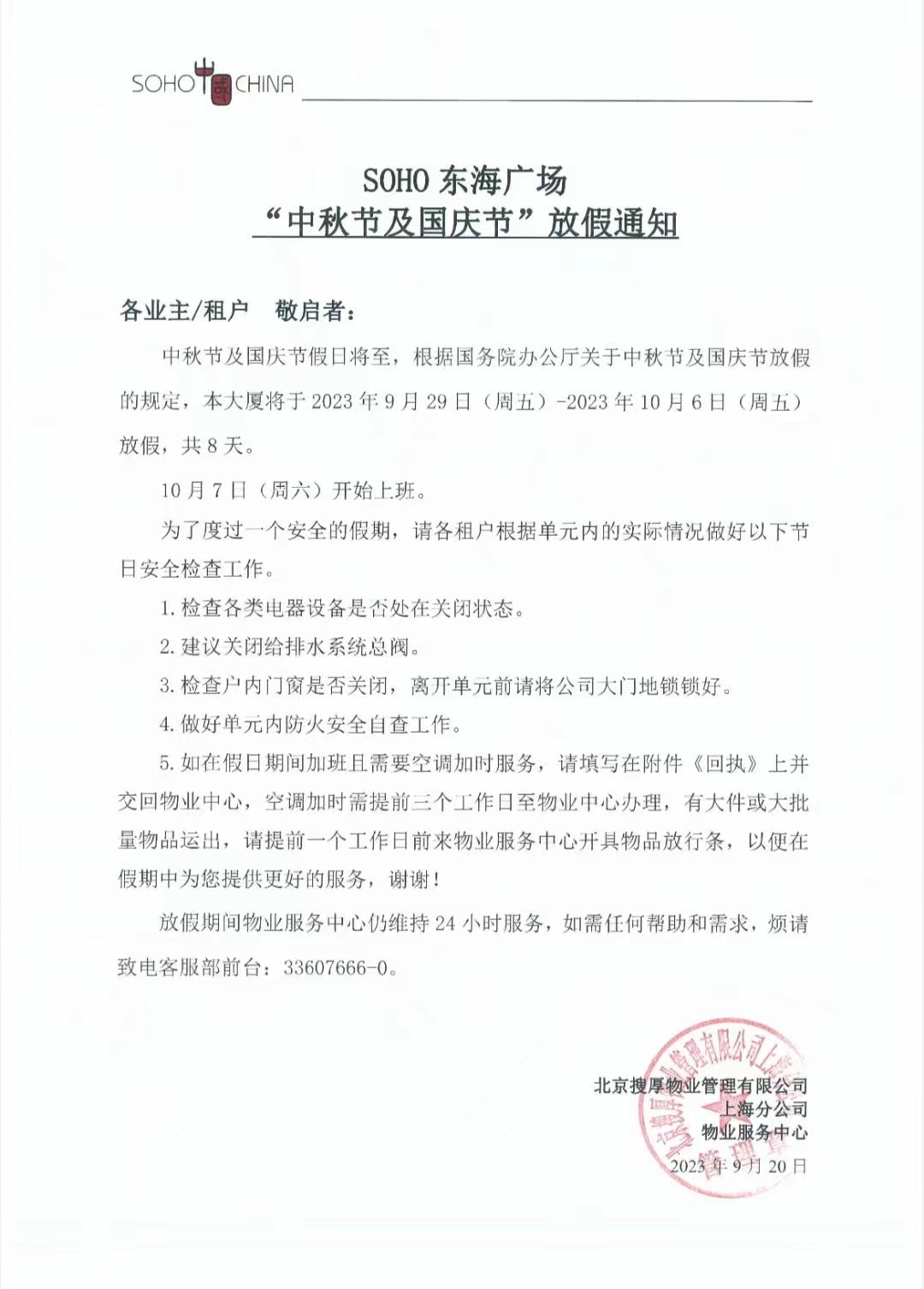 SOHO东海广场2023年“中秋国庆”节放假通知