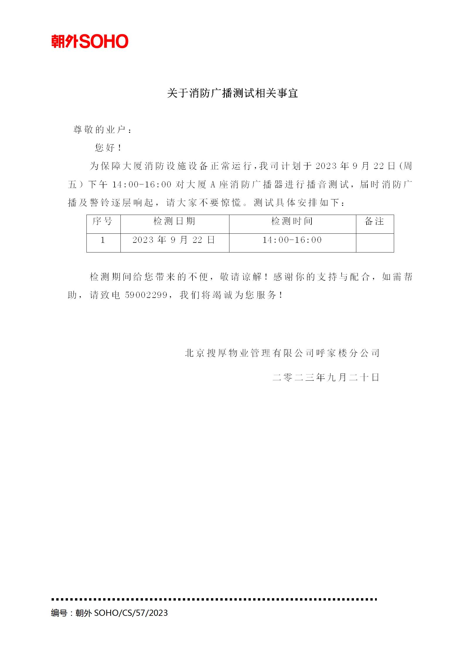 关于消防广播测试事宜2023.09.20