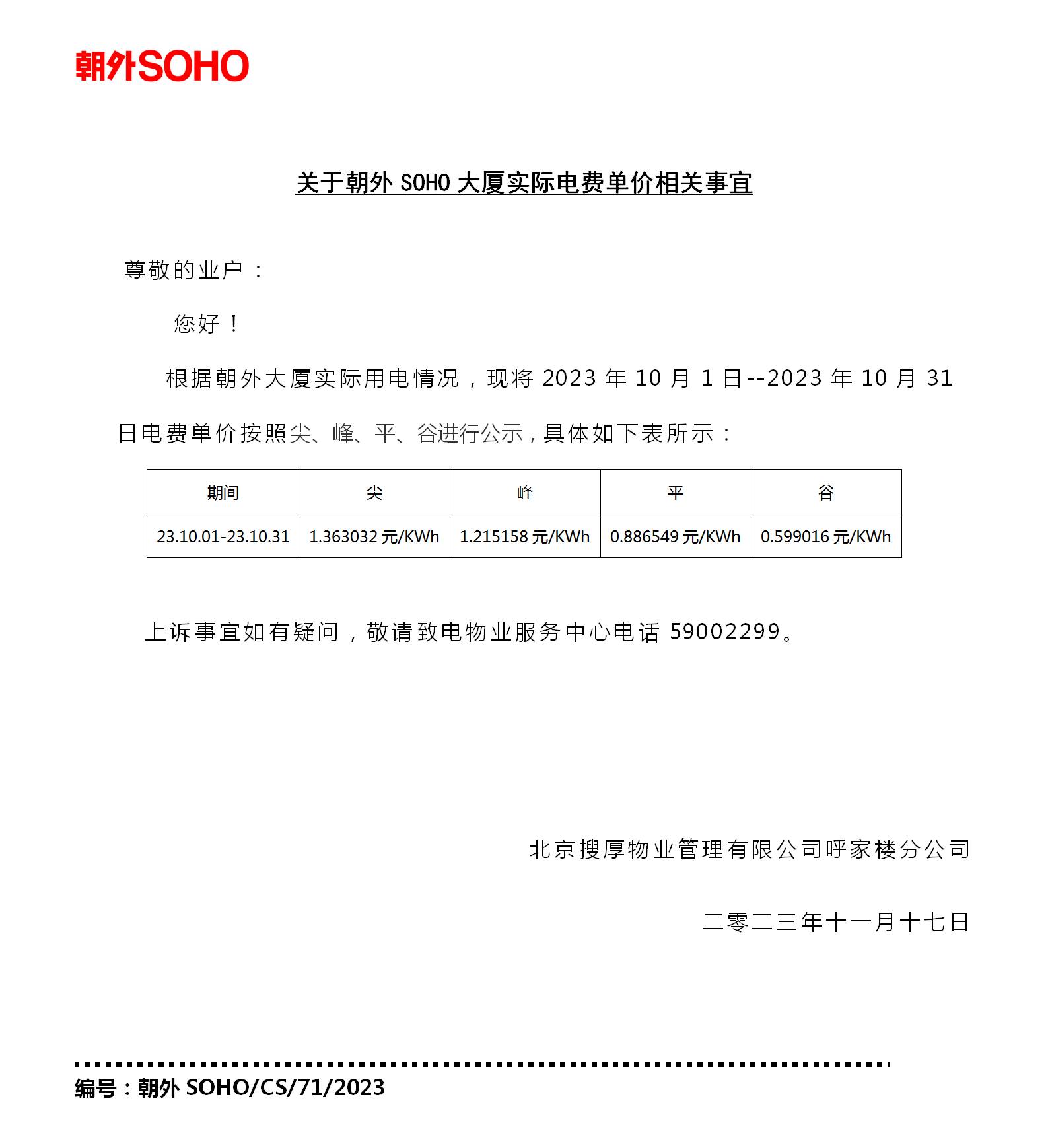 关于朝外SOHO大厦2023.10.01-2023.10.31期间实际电费单价相关事宜