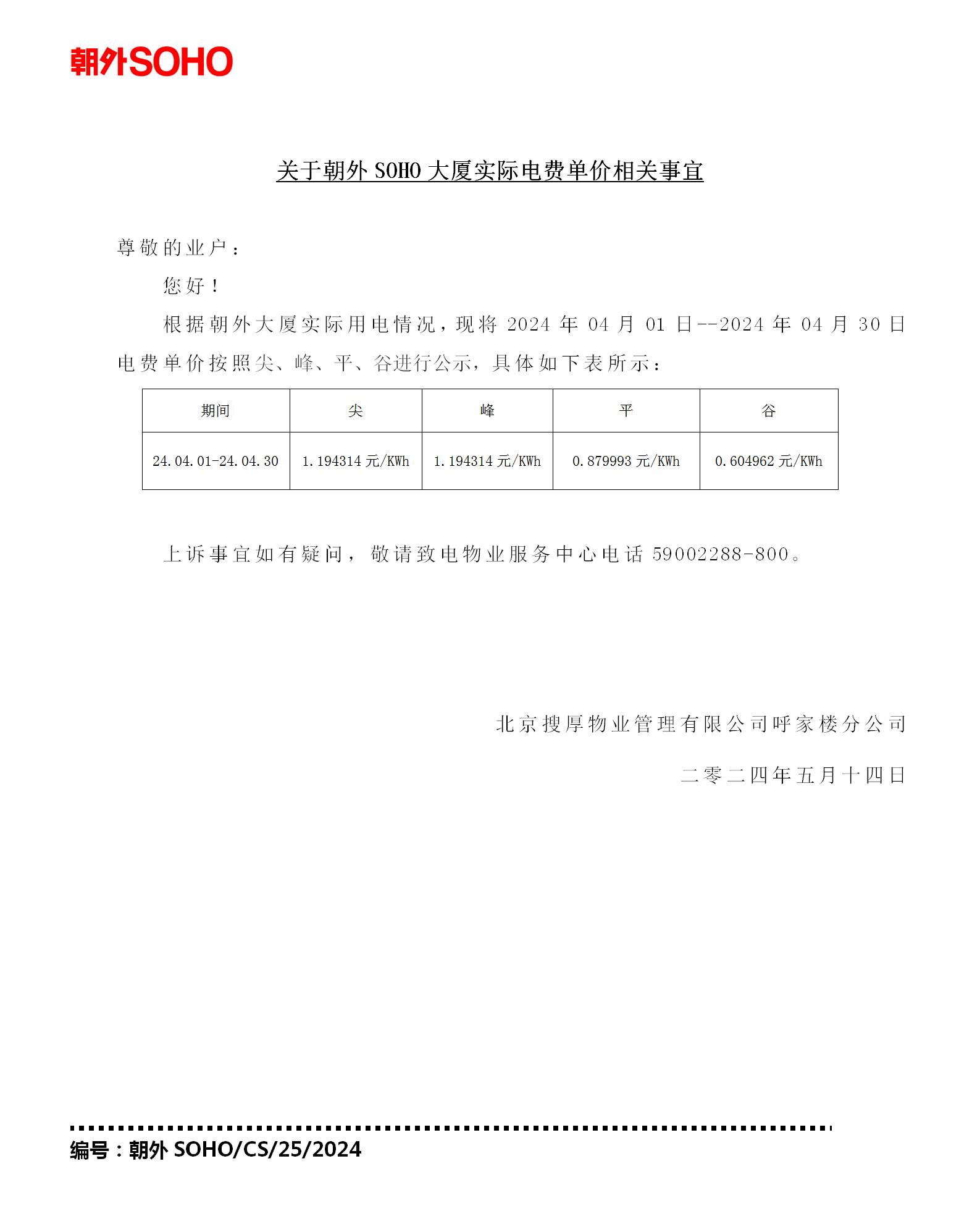 关于朝外SOHO大厦2024.04.01-2024.04.30期间实际电费单价相关事宜