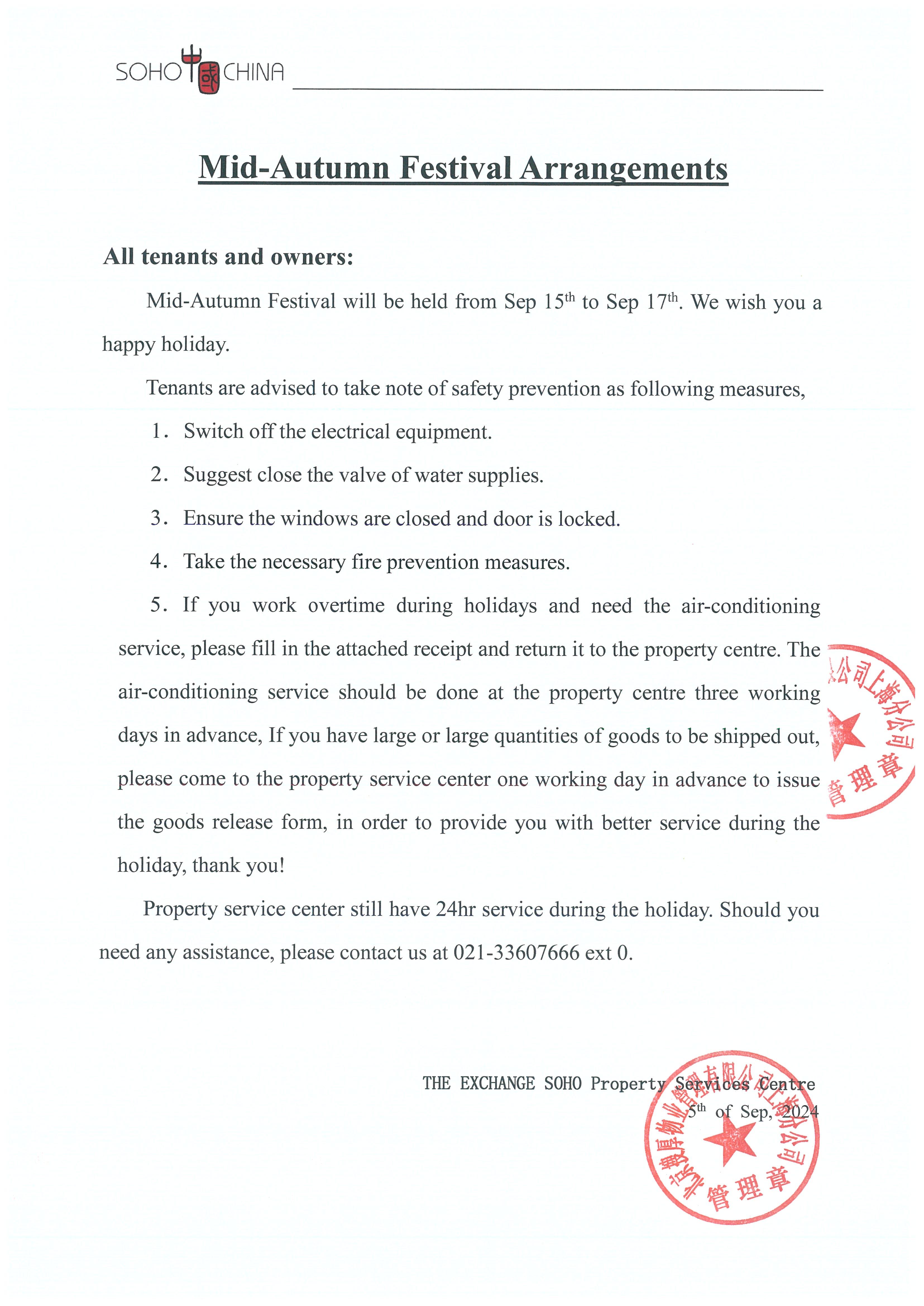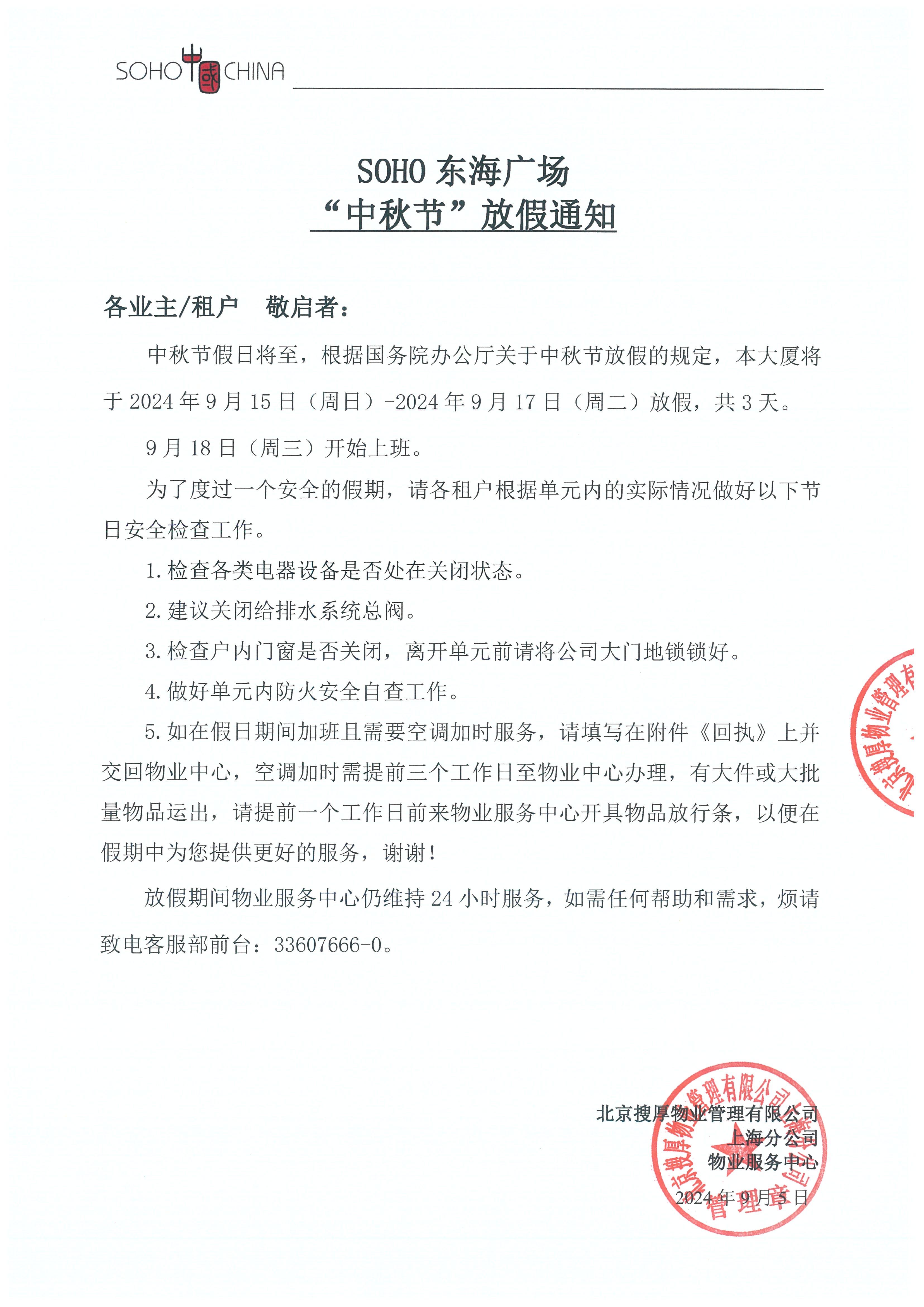 SOHO东海广场2024年“中秋”节放假通知