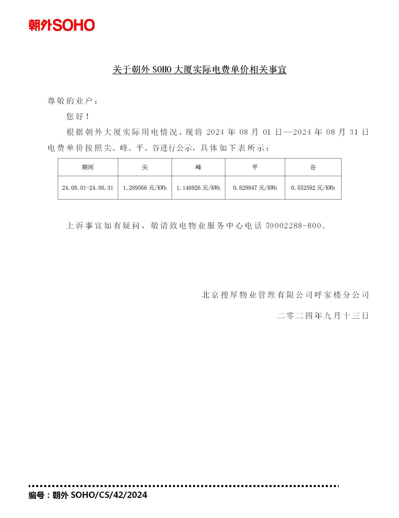 关于朝外SOHO大厦2024.08.01-2024.08.31期间实际电费单价相关事宜