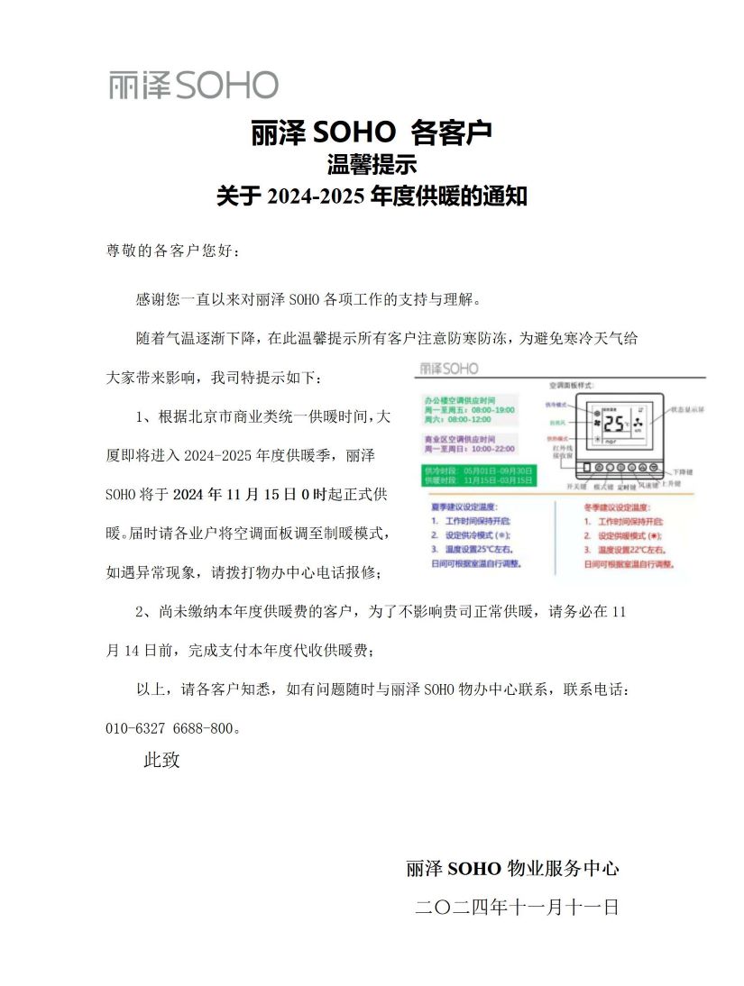 关于丽泽SOHO 2024-2025年度供暖的通知