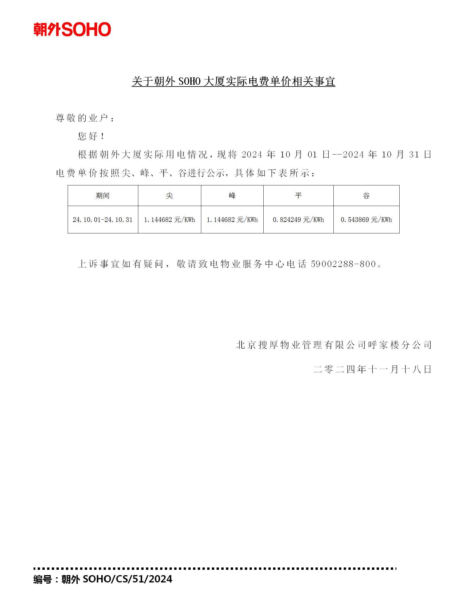 关于朝外SOHO大厦2024.10.01-2024.10.31期间实际电费单价相关事宜
