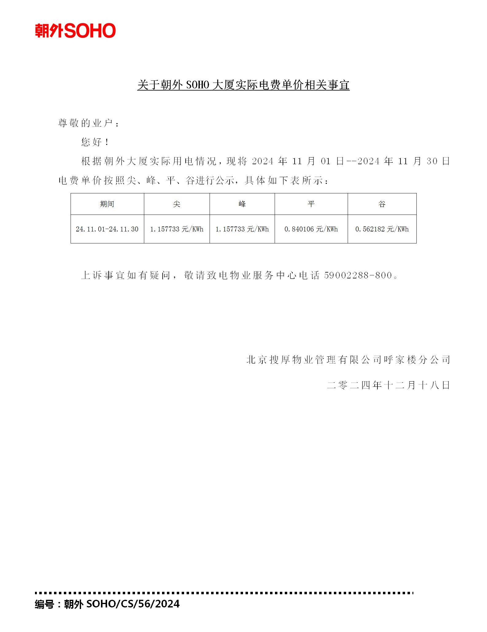 关于朝外SOHO大厦2024.11.01-2024.11.30期间实际电费单价相关事宜