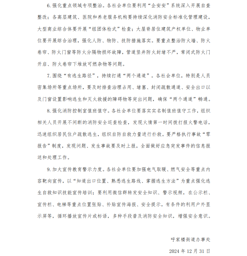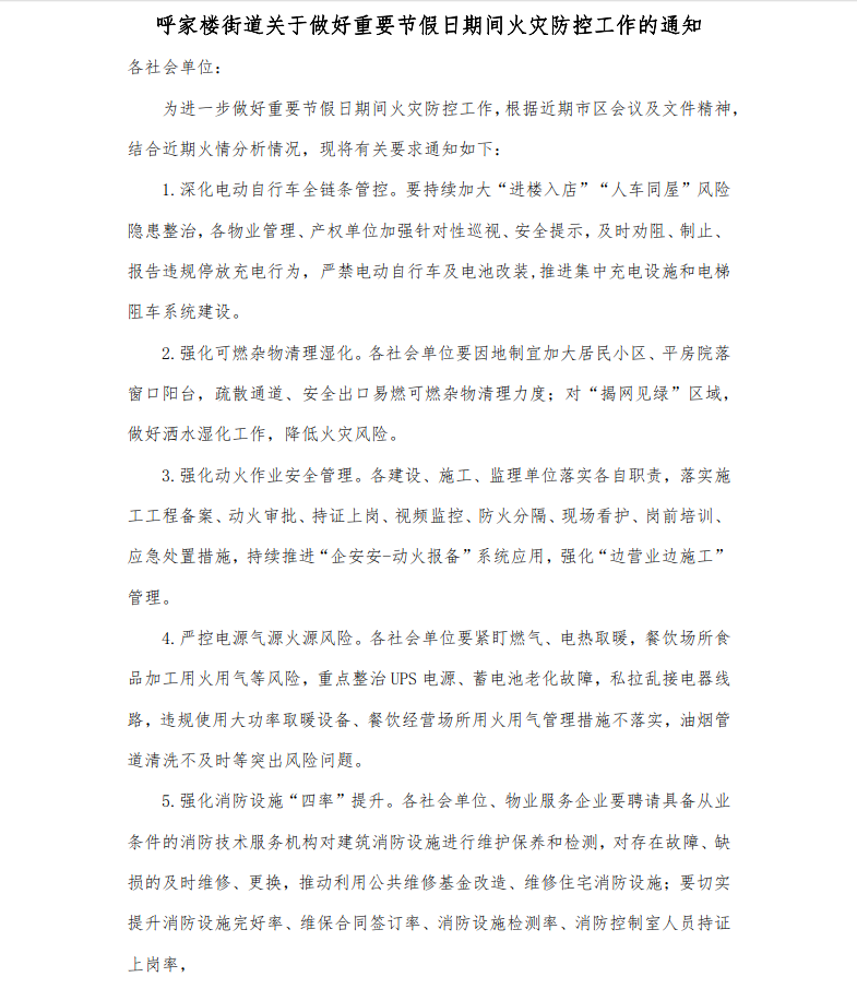 呼家楼街道关于做好重要节假日期间火灾防控工作的通知