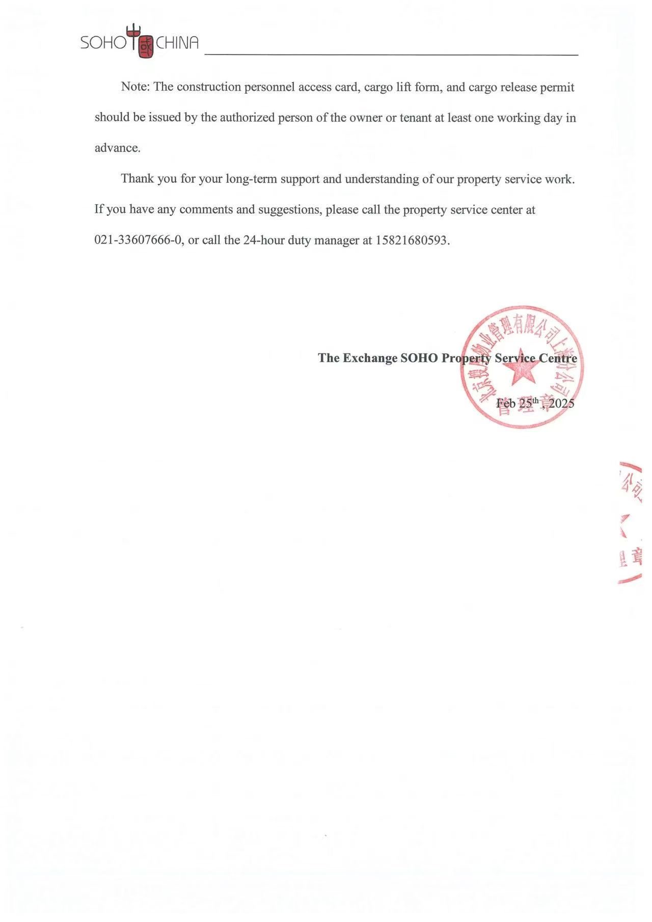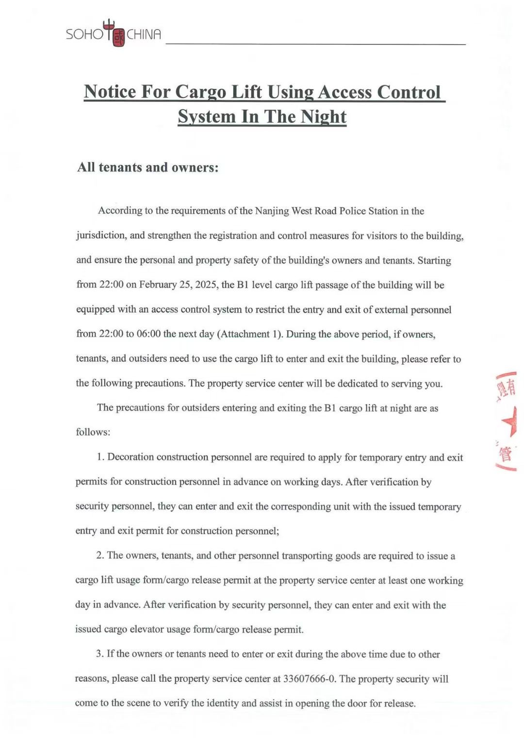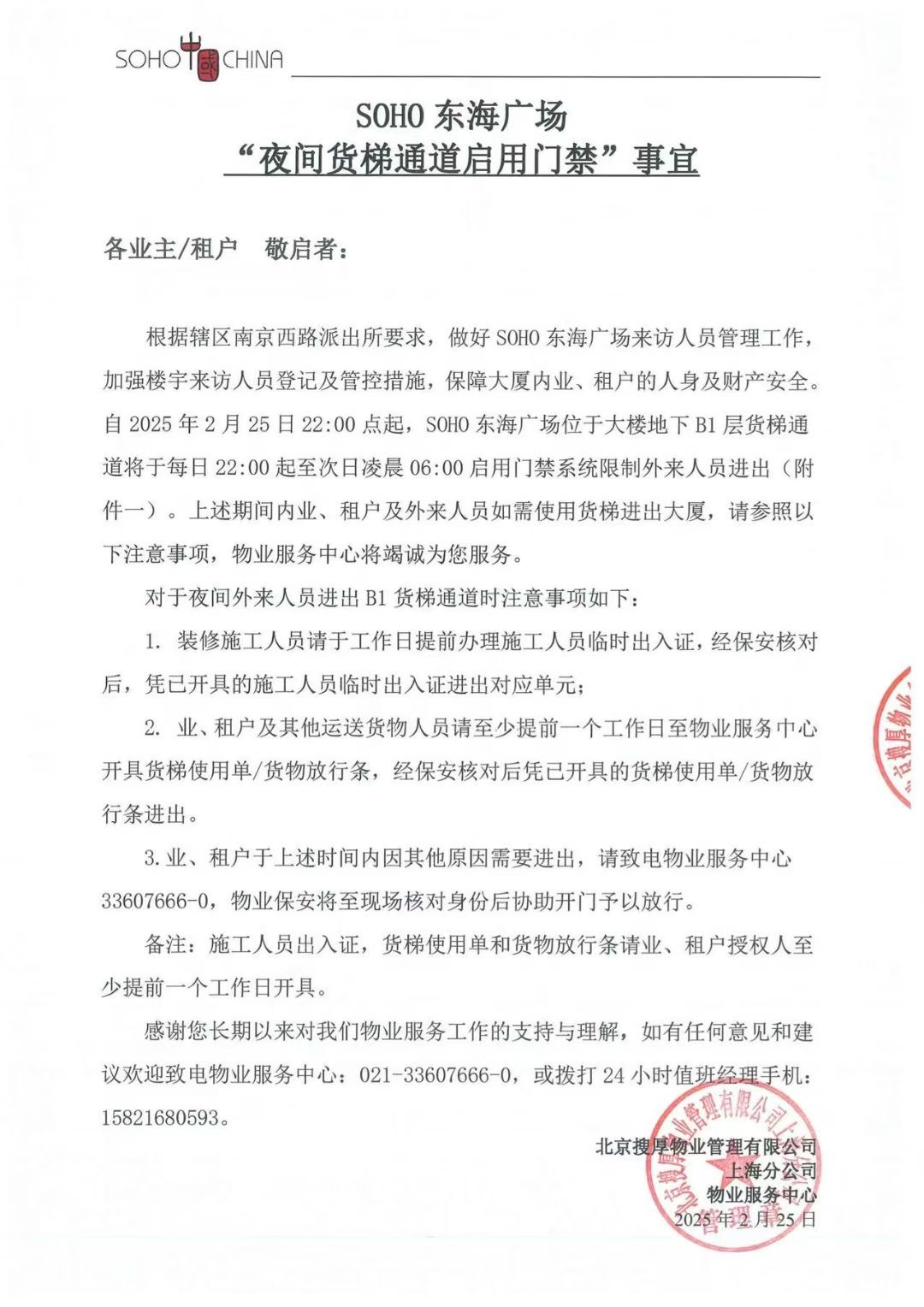 SOHO东海广场大厦夜间货梯通道门禁事宜通知