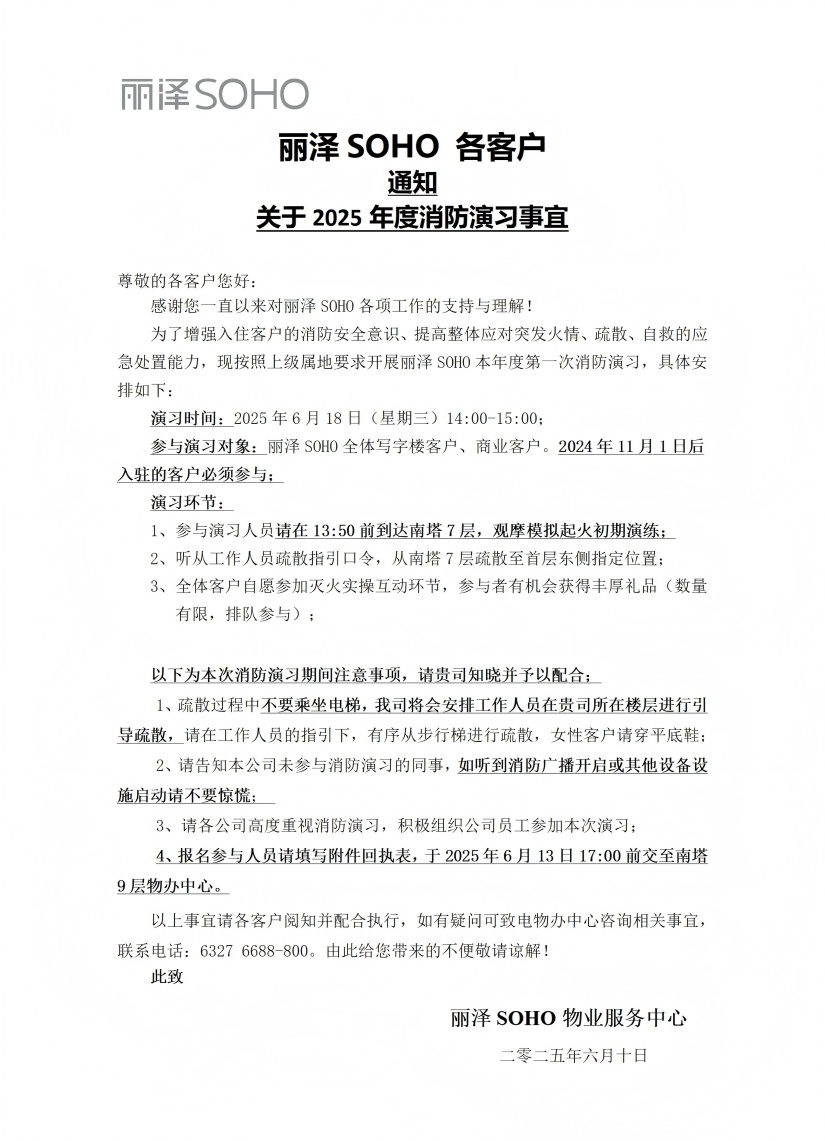 关于丽泽SOHO消防演习通知