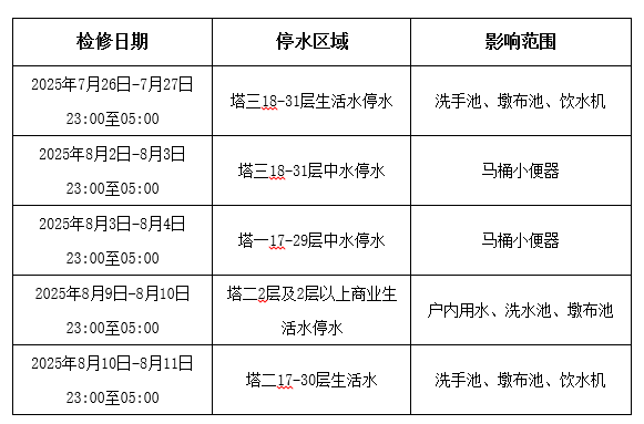 项目将于近日对大厦水泵系统进行部分检修工作,涉及相关楼层部分停水,具体停水时间及受影响区域详见下表: