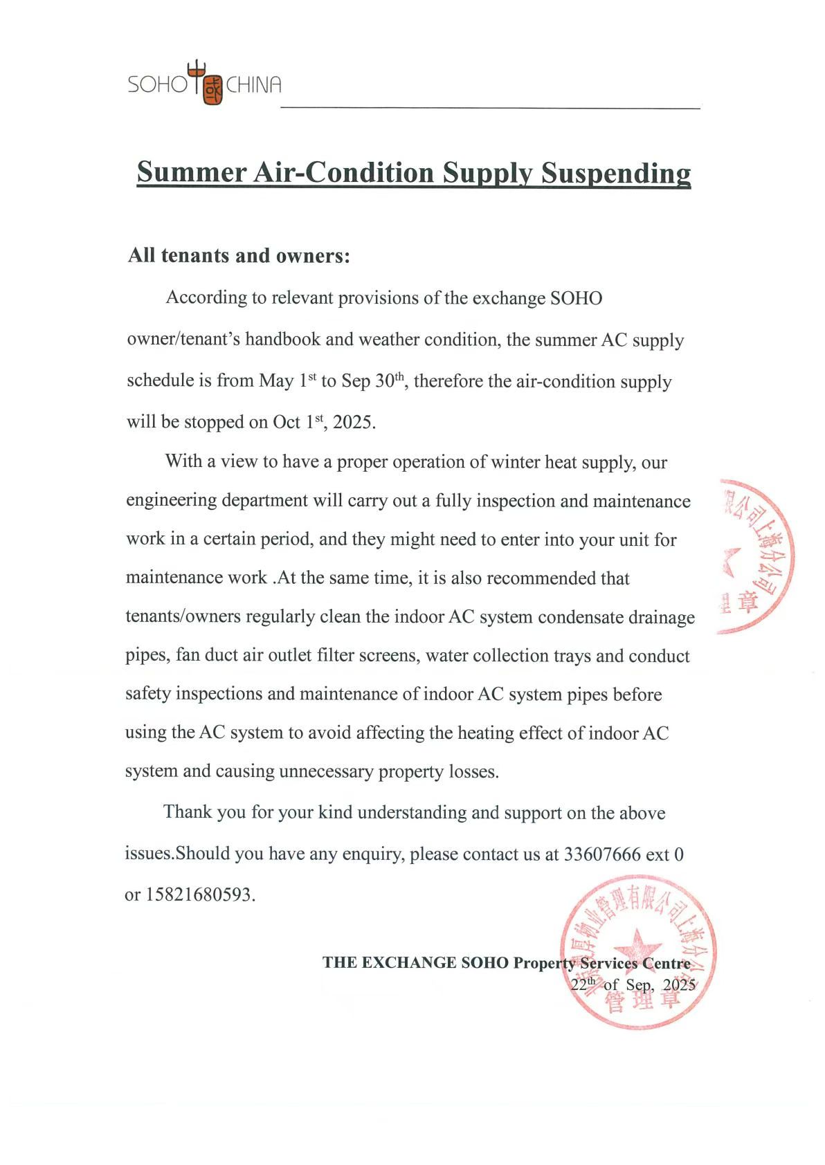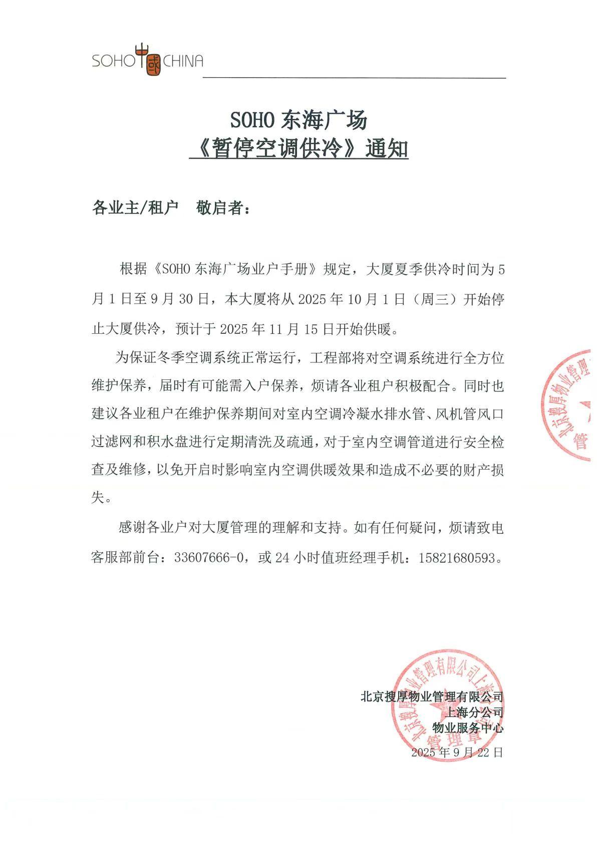 SOHO东海广场“暂停空调供冷”通知
