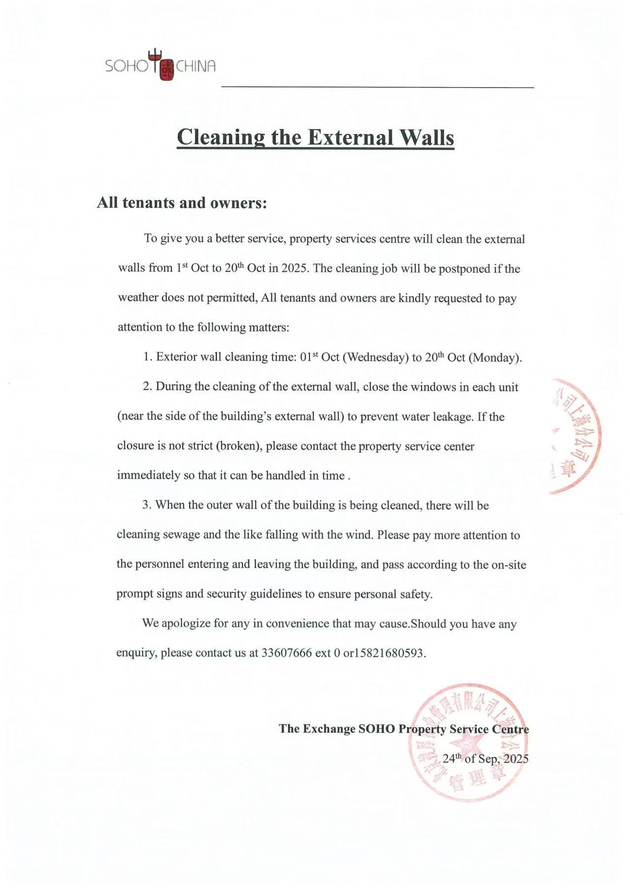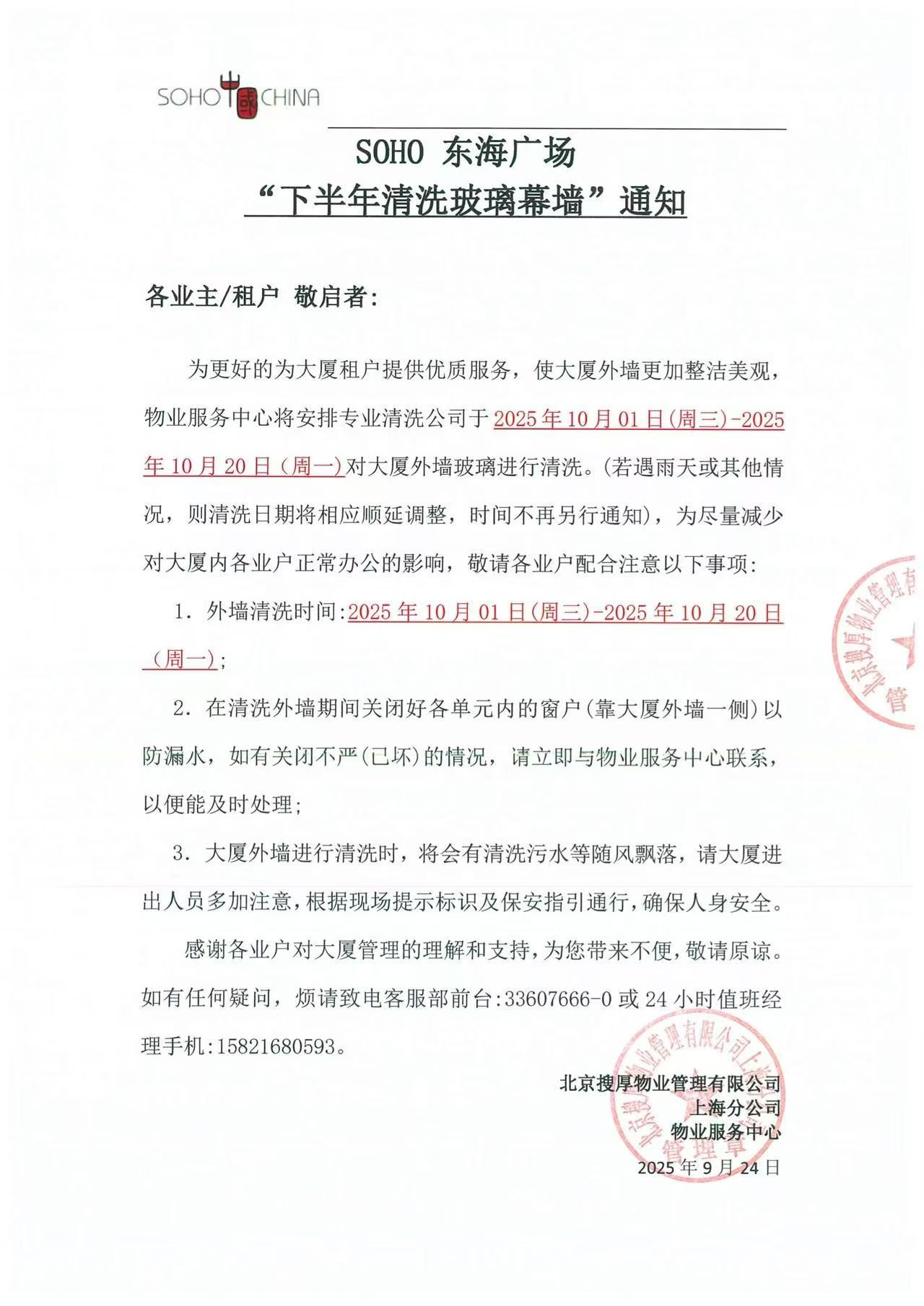 SOHO东海广场“下半年清洗玻璃幕墙”通知