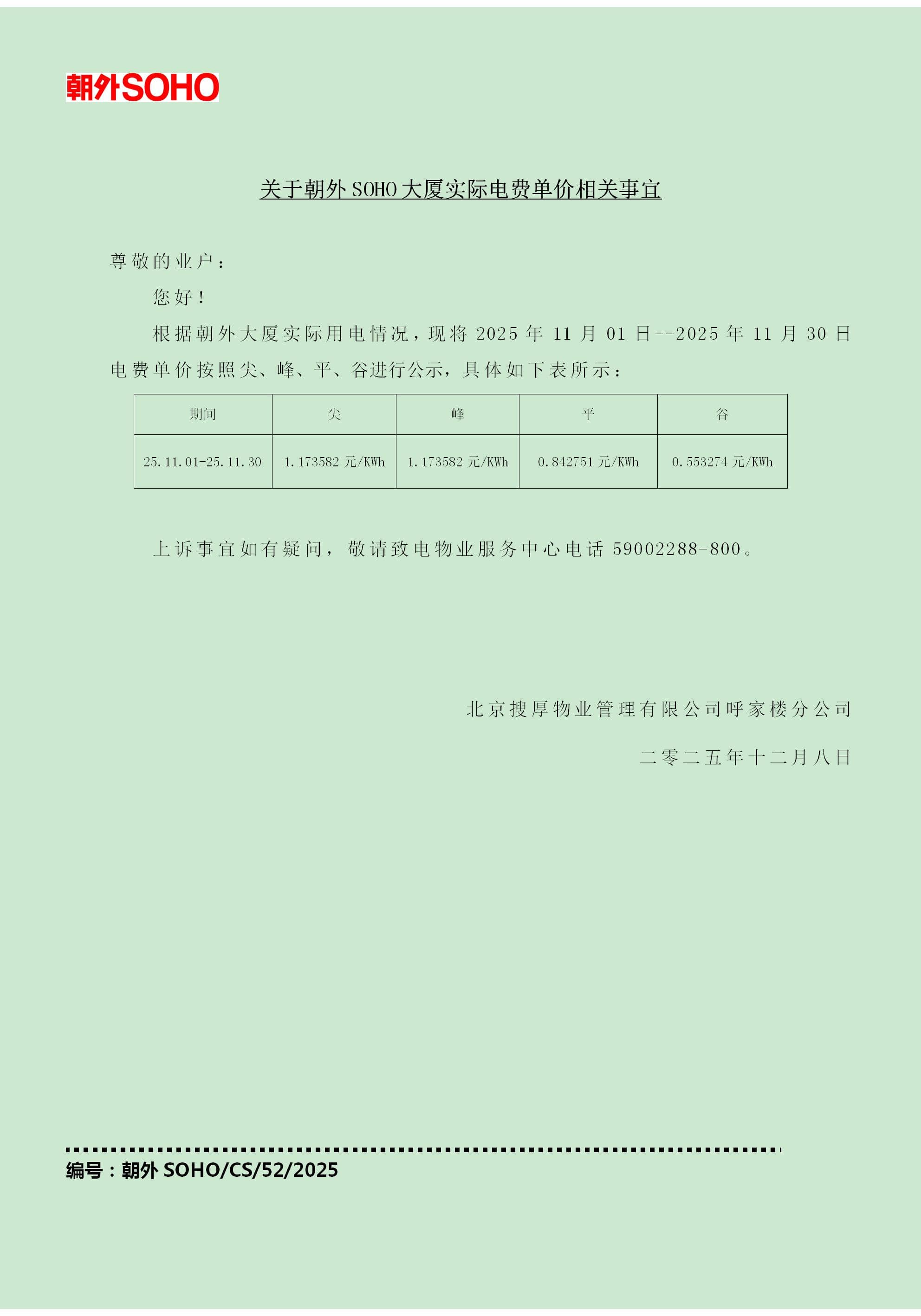 关于朝外SOHO大厦2025.11.01-2025.11.30期间实际电费单价相关事宜