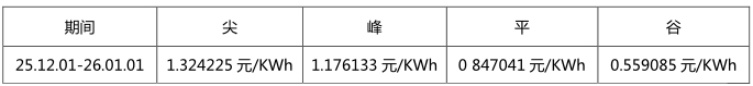 根据光华路SOHO2实际用电情况,现将2025年12月01日——2026年01月01日电费单价按照尖、峰、平、谷进行公示,具体如下表所示: