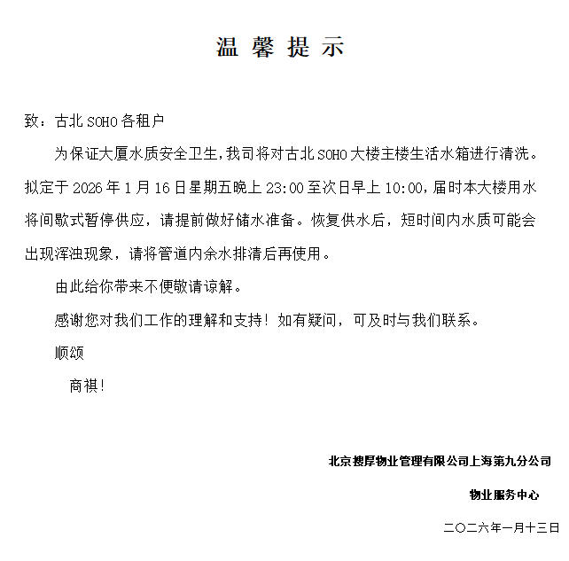 古北SOHO水箱清洗的通知