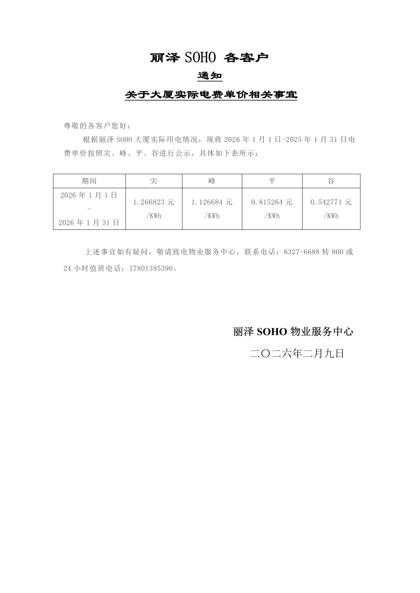 丽泽SOHO实际电费单价相关事宜