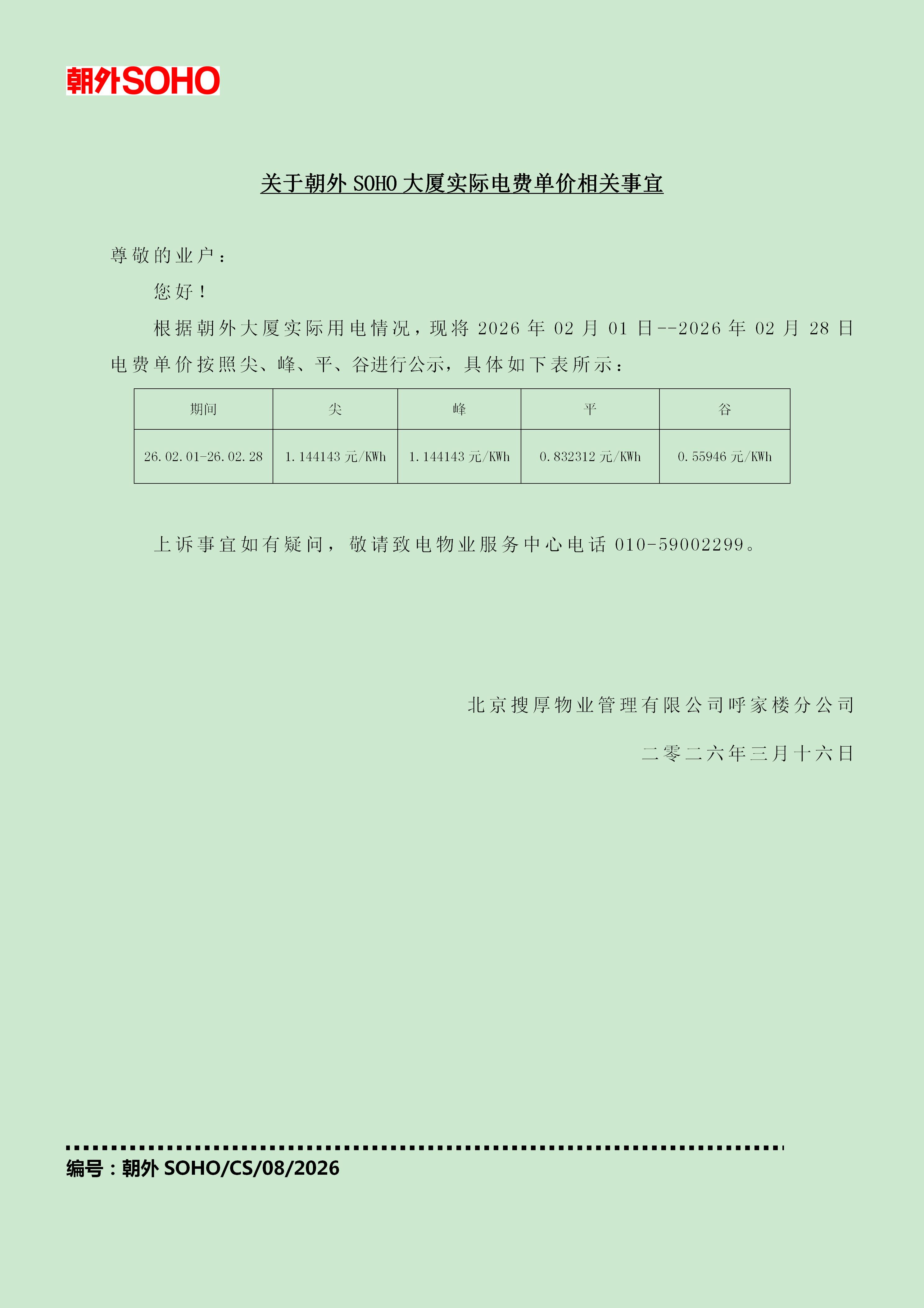 关于朝外SOHO大厦2026.02.01-2026.02.28期间实际电费单价相关事宜