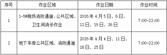 如题所述,为给业户提供良好的工作环境,近期物业公司将安排专业消杀公司对三里屯SOHO公共区域进行全面消杀灭虫工作,如您喂养宠物,请注意不要在公共区域内停留,避免因误食或其他原因而造成不必要的伤害及损失。具体的消杀工作安排如下: