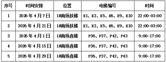 根据三里屯SOHO特种设备年度保养计划安排,物业公司将于近期对大厦内直梯、扶梯进行日常维保,在此期间将暂停电梯运行,为不影响广大业户正常使用,此次将逐部电梯分别停运。具体情况如下: