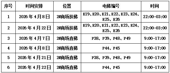 根据三里屯SOHO特种设备年度保养计划安排,物业公司将于近期对大厦内直梯、扶梯进行日常维保,在此期间将暂停电梯运行,为不影响广大业户正常使用,此次将逐部电梯分别停运。具体情况如下: