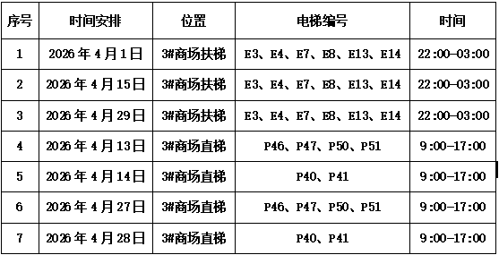 根据三里屯SOHO特种设备年度保养计划安排,物业公司将于近期对大厦内直梯、扶梯进行日常维保,在此期间将暂停电梯运行,为不影响广大业户正常使用,此次将逐部电梯分别停运。具体情况如下: