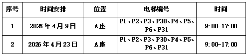 根据三里屯SOHO特种设备年度保养计划安排,物业公司将于近期对大厦内直梯进行日常维保,在此期间将暂停电梯运行,为不影响广大业户正常使用,此次将逐部电梯分别停运。具体情况如下: