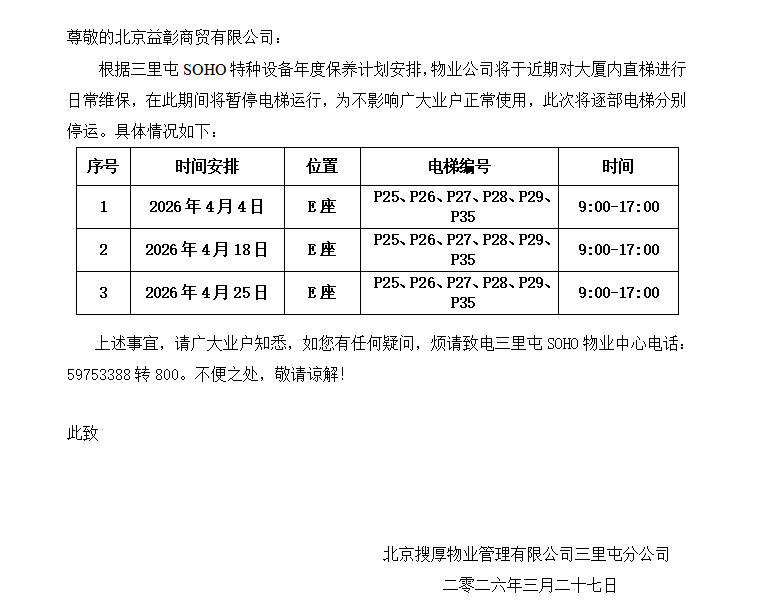 关于大厦电梯保养工作安排事宜(E座)