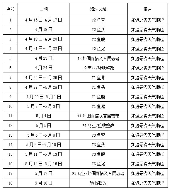 此次清洁工作期间如遇下雨、大风等客观原因导致清洗工作无法进行时,清洗工期将自动顺延。