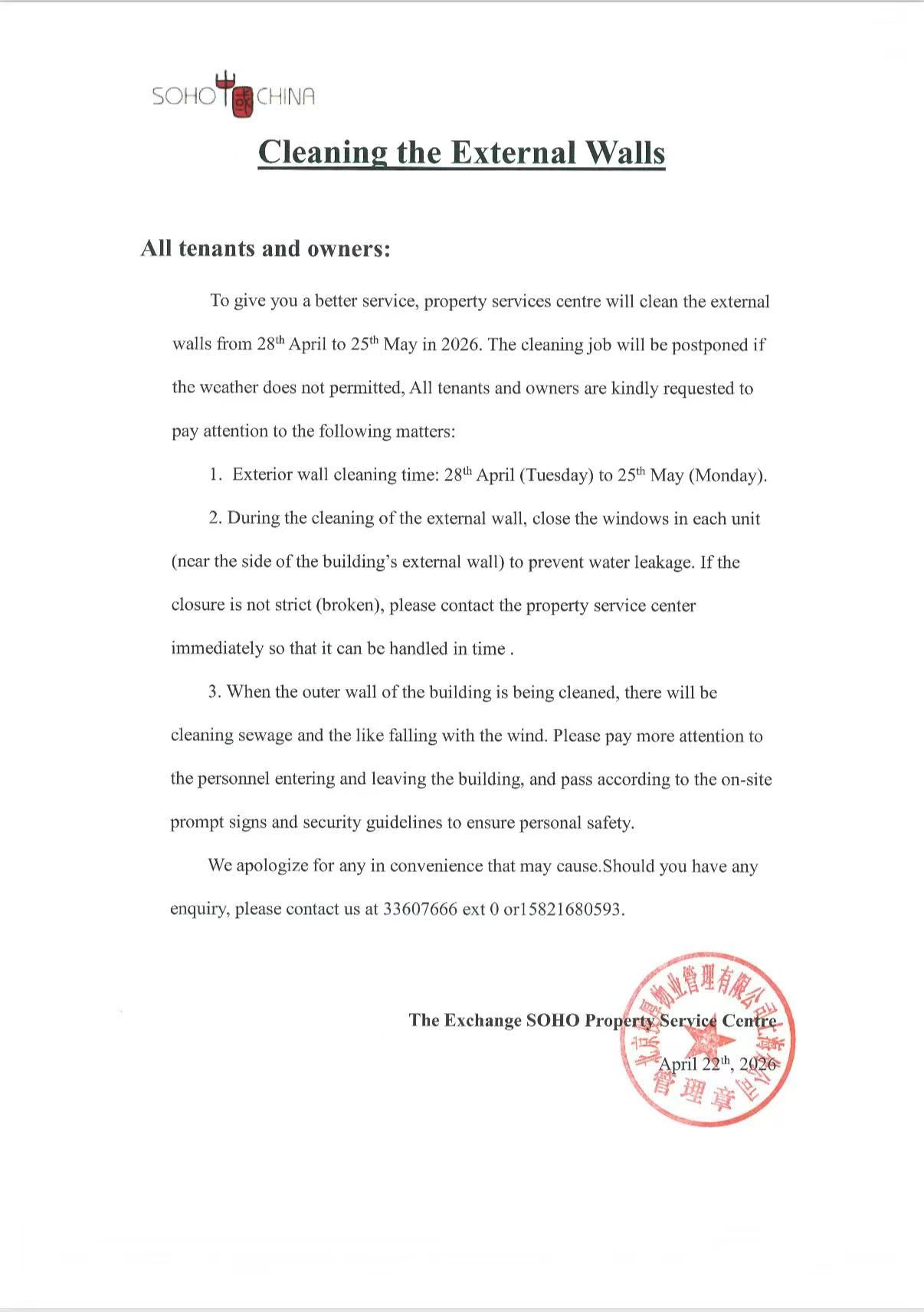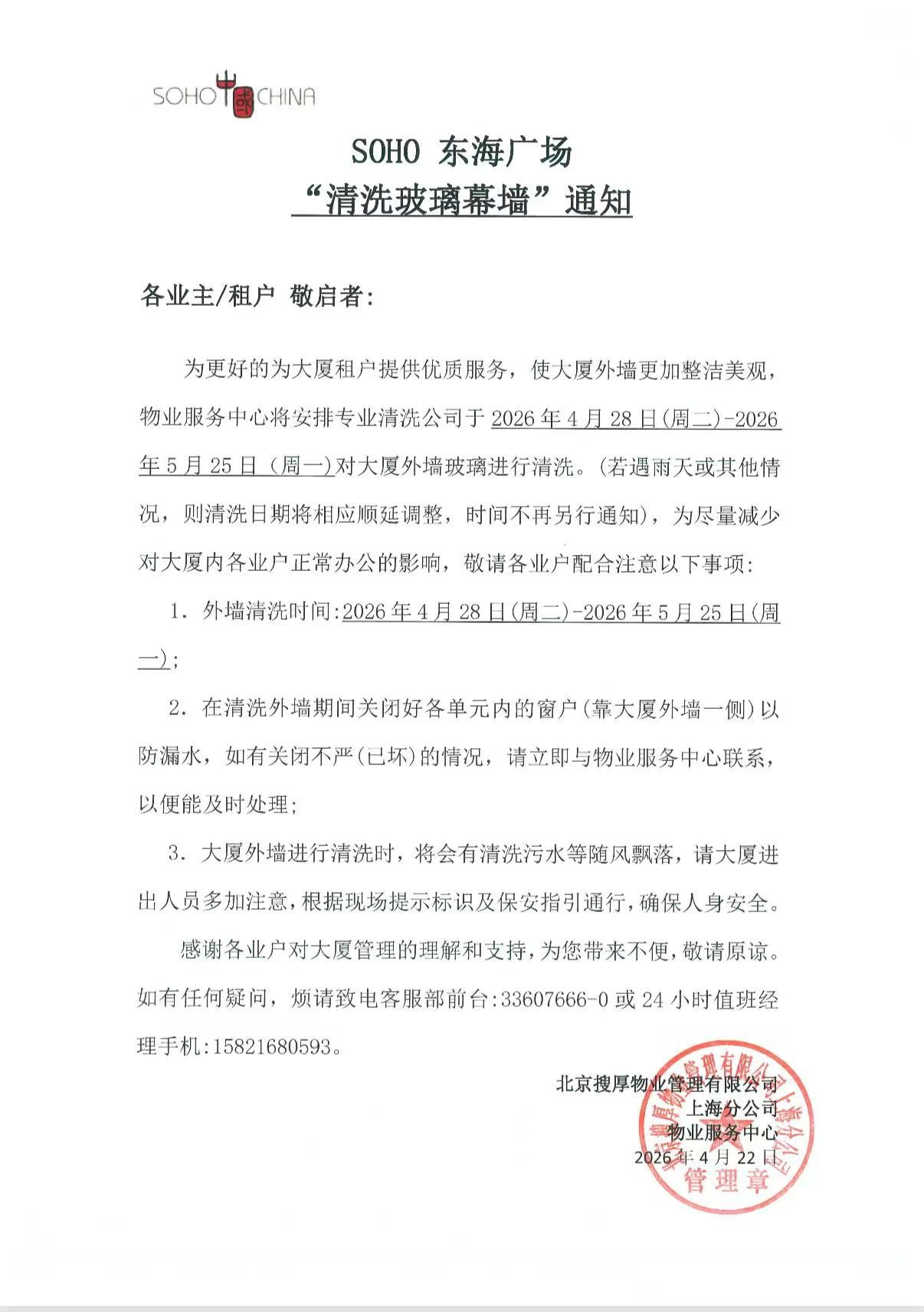 SOHO东海广场“清洗玻璃幕墙”通知