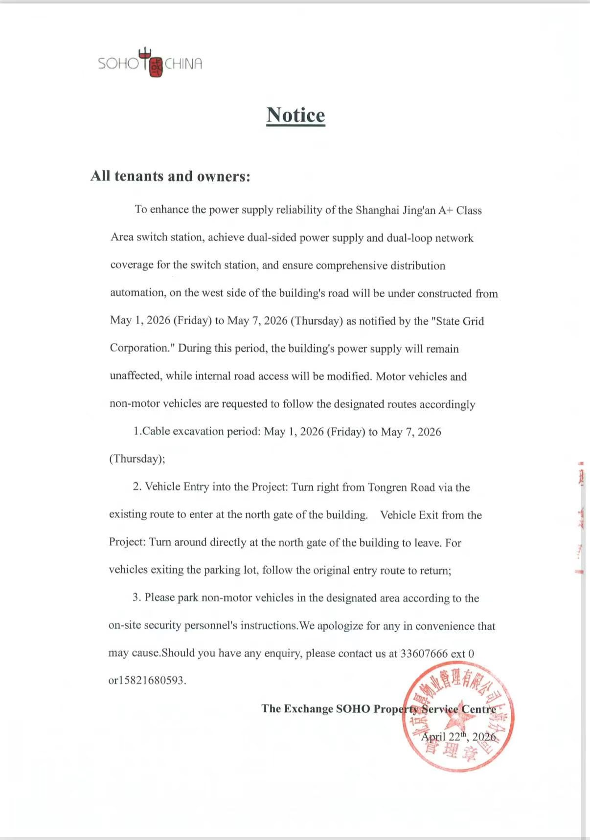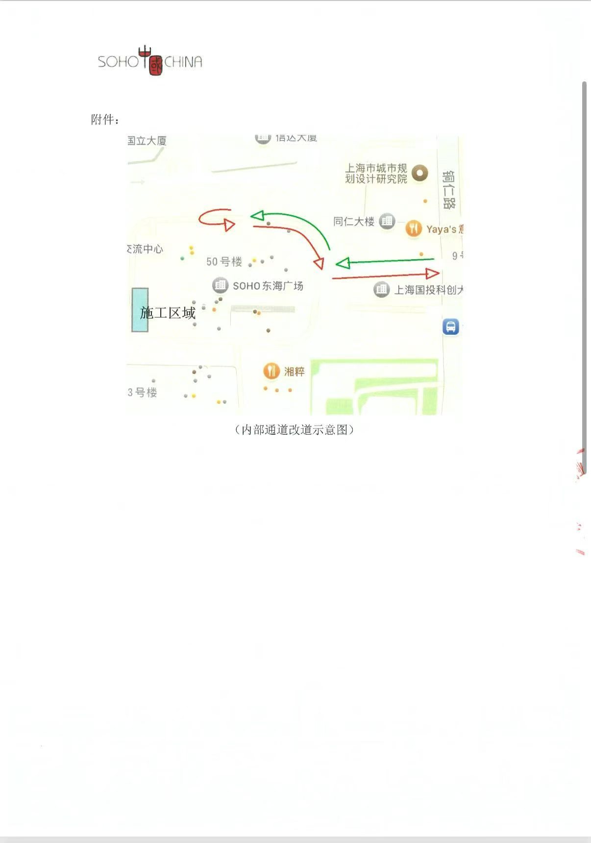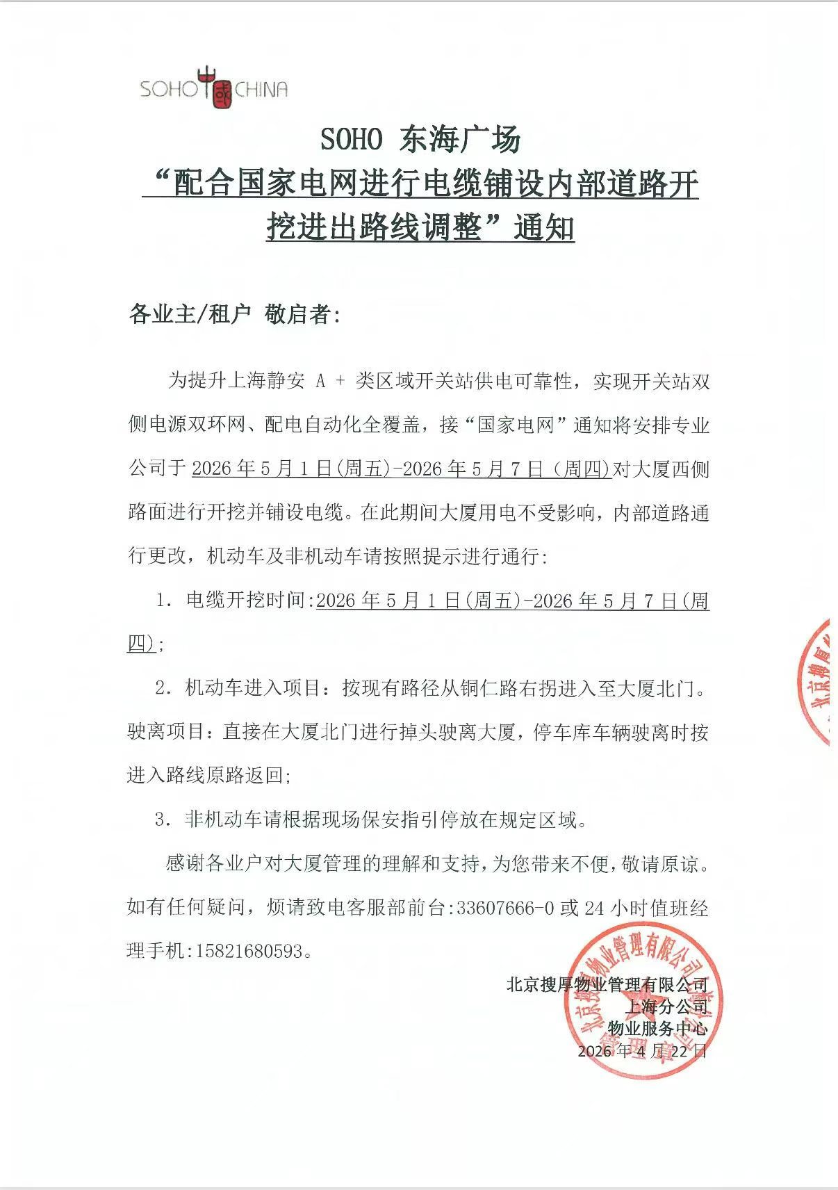 SOHO东海广场“配合国家电网进行电缆铺设内部道路开挖进出线路调整”通知
