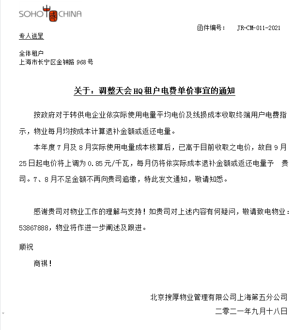 关于:天会HQ调整租户电费单价事宜的通知