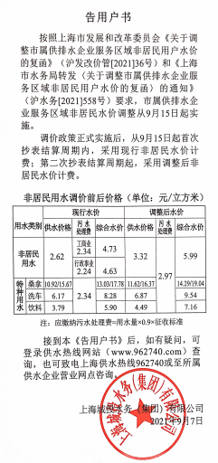 为贯彻落实上海市发展和改革委员会发布的(沪发改价管[2021]36号)、(沪水务[2021]558号)文件要求,SOHO中山广场即日起水费单价由原来的5元/立方米调整为5.99元/立方米。
