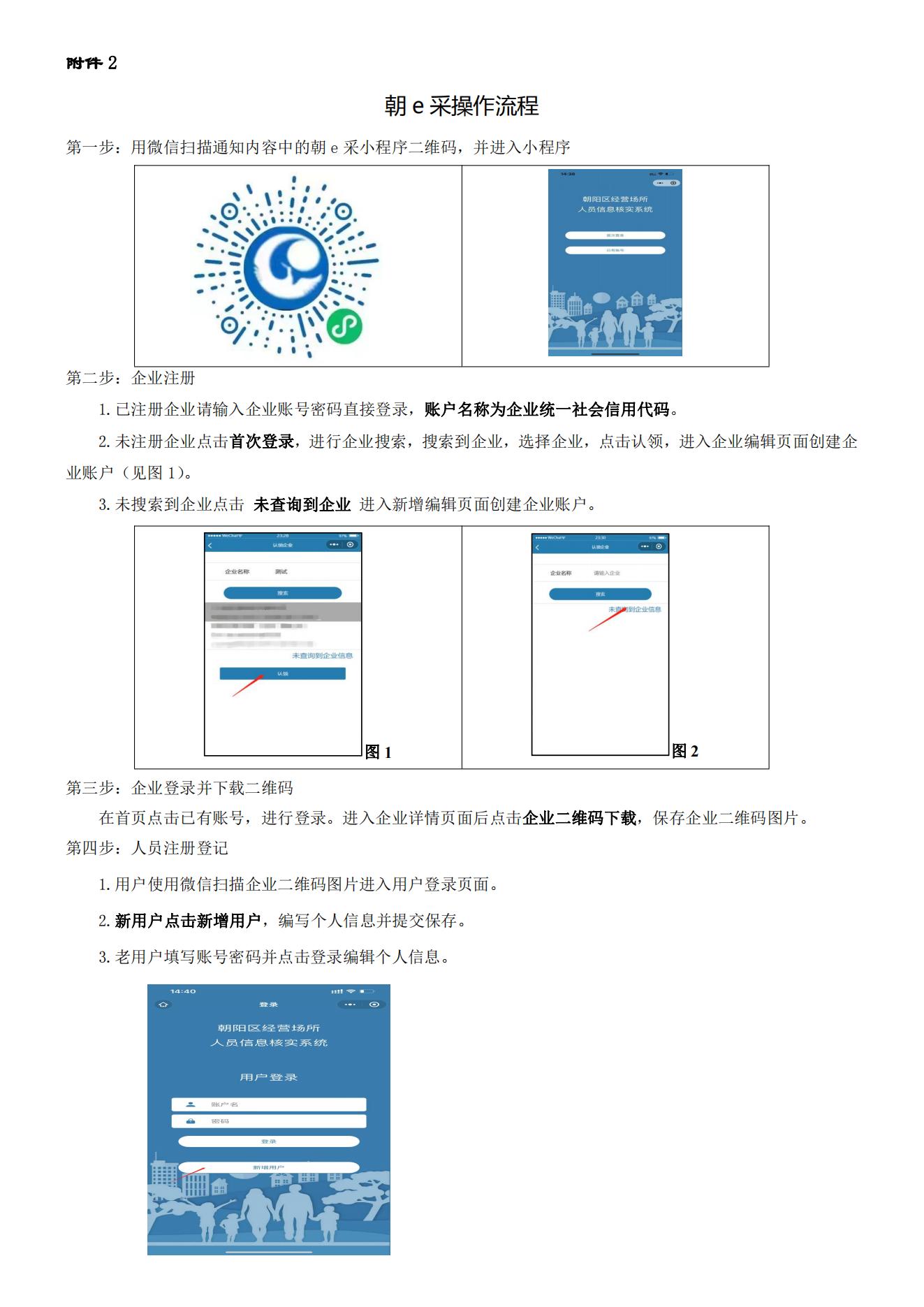 各单位要全面摸排、动态掌握固定用工、临时用工、钟点工等各类人员信息,建立全量人员信息台账,确保不漏一人。并配合将人员信息录入“朝阳区经营场所人员信息管理系统”(即“朝e采”小程序,见下图,具体操作流程请参考附件2),并根据到岗人员的变化,动态更新和维护相关信息。
