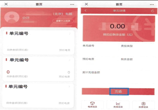 (1)望京SOHO微信公众号→右下方物业服务→电费缴纳,完成登录进入主界后自助充值电费以及查看余额和使用量,如下如所示:
