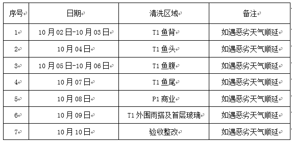 此次清洁工作期间如遇下雨、大风等客观原因导致清洗工作无法进行时,清洗工期将自动顺延。